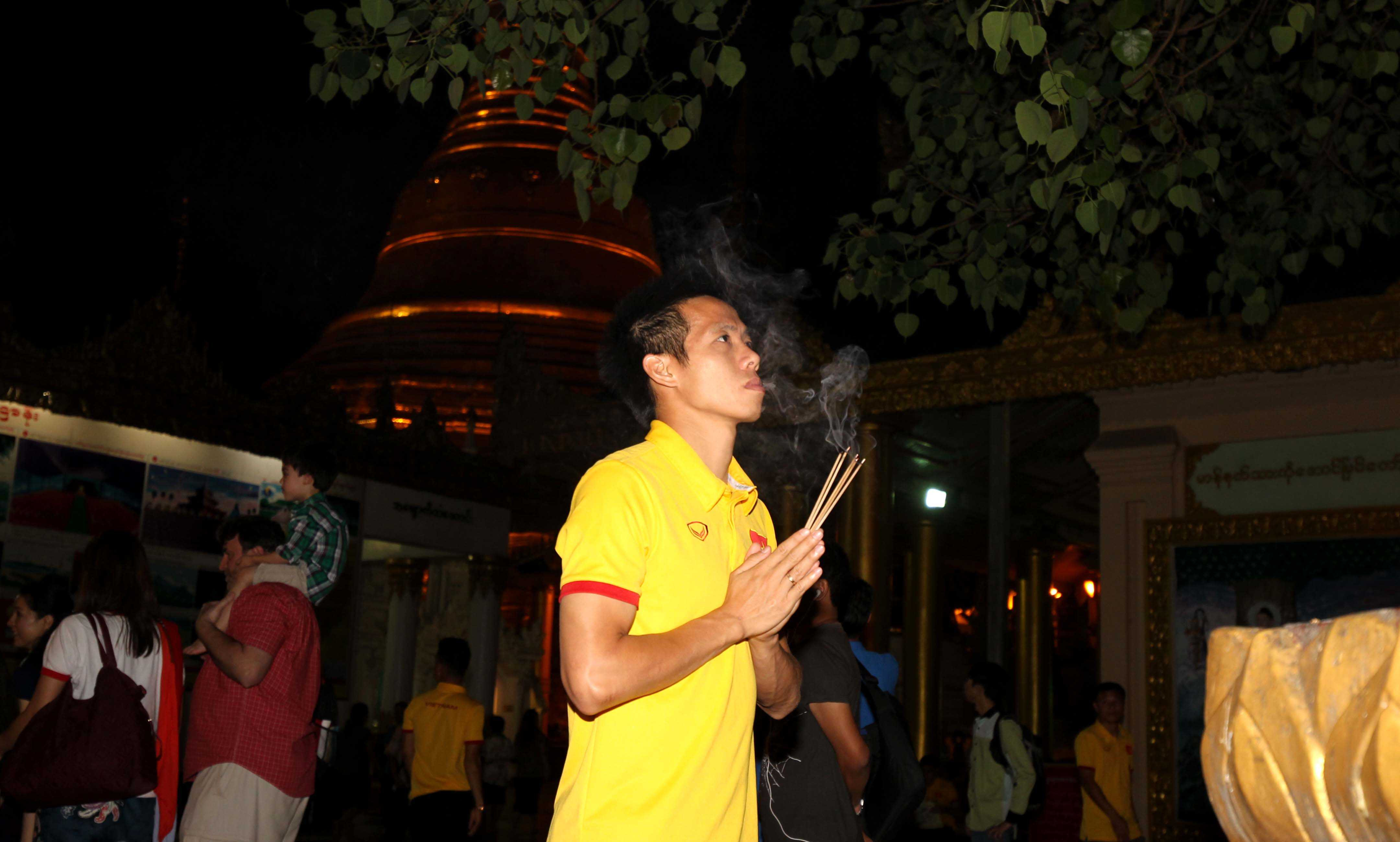 Sáng qua, tuyển Việt Nam được nghỉ tập, vì thế, tối qua 17/11, toàn đội đã tranh thủ ghé thăm chùa Shwedagon, ngôi chùa lớn nhất Myanmar (Ảnh Hoàng Tùng)