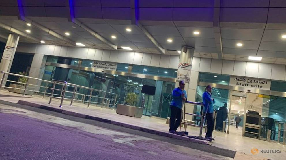 Nhân viên vệ sinh đeo khẩu trang đứng ngoài sảnh sân bay quốc tế Cairo, Ai Cập ngày 5/2/2020. (Ảnh: Reuters)