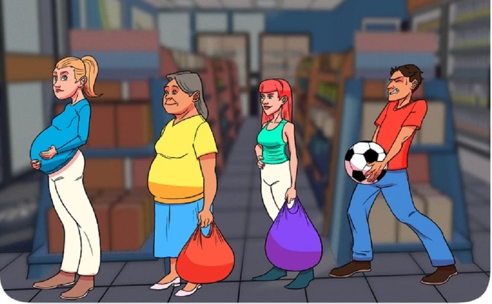 Tại siêu thị, bốn người đang xếp hàng chờ thanh toán món hàng của mình. Một trong số họ đã đánh cắp và giấu quả dưa hấu. Người đó là ai?
