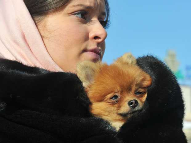 | Một phụ nữ đang cố gắng ủ ấm cho chú chó của mình ở ngoại ô Kiev (Ucraina) hôm 4/2. Ảnh: AFP |