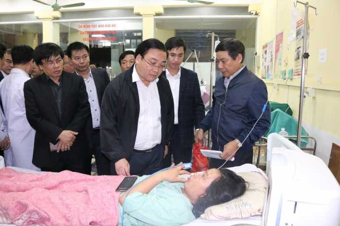 | Bí thư Thành ủy Hà Nội Hoàng Trung Hải thăm nạn nhân vụ nổ tại Bệnh việnĐa khoa Hà Đông. Ảnh: hanoi.gov.vn |