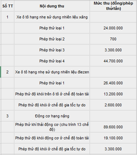 | Bảng chi phí các thử nghiệm khí thải do Bộ Tài chính ban hành |