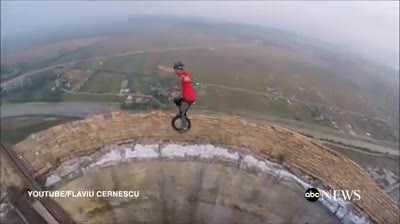 Màn đi xe đạp một bánh trên ống khói chót vót cao 256 mét đầy mạo hiểm của chàng trai khiến người xem cũng không dám nhìn xuống.