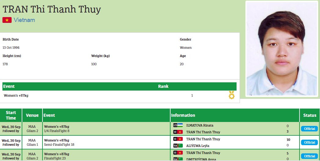 Trần Thị Thanh Thủy của Việt Nam cũng mang cảm giác ấy. Ở hạng cân trên 87kg của nữ, sau khi đánh bại võ sĩ Ilmatova Rinata của Uzbekistan với tỷ số 3-0, Thanh Thúy đã đụng phải Aliyewa Leyla của nước chủ nhà. Chỉ có thắng thuyết phục mới giúp Thanh Thủy chắc chắn đi tiếp. Cũng bởi vậy, võ sĩ sinh năm 1996 đã thi đấu với tinh thần quyết tâm cao, cô áp đảo trước đối thủ và liên tục ghi điểm để rồi kết thúc trận bán kết với điểm số cách biệt 10-0.
