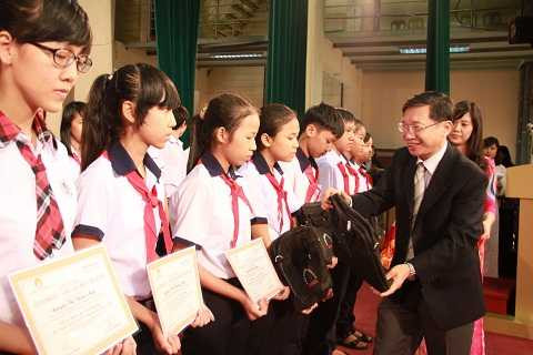 | Ông Haruhiko Yasuga – Tổng Giám Đốc Công ty Gas Việt Nam - Nhật Bản trao học bổng cho học sinh |
