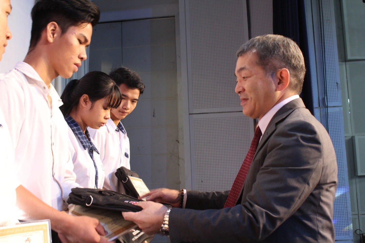 Ông Keiji Kaneko – Tổng Giám đốc Công ty Ajinomoto Việt Nam trao học bổng cho các em học sinh