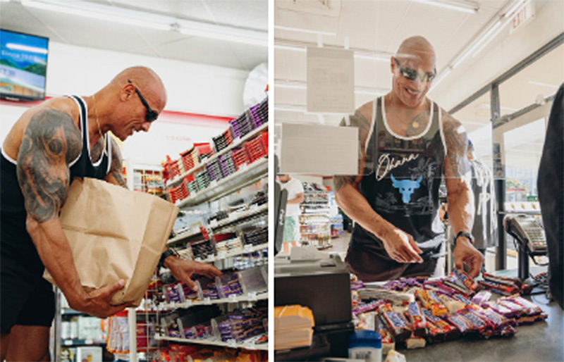 Không chỉ mua hết số kẹo Snickers tại 7-Eleven, The Rock còn hào phóng trả tiền thay cho nhiều khách hàng khác đang chờ thanh toán. Nam diễn viên cũng hào hứng chụp ảnh và nói chuyện cùng những người dân đang mua sắm tại đây.