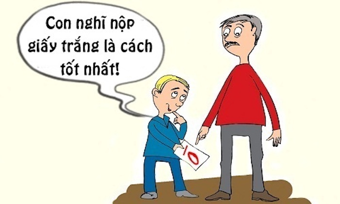 Con trai nhận được điểm 0 tròn trĩnh cho bài kiểm tra cuối kỳ, Tý tức giận hỏi: "Tồ, sao con nộp giấy trắng để ăn điểm 0 thế này?".