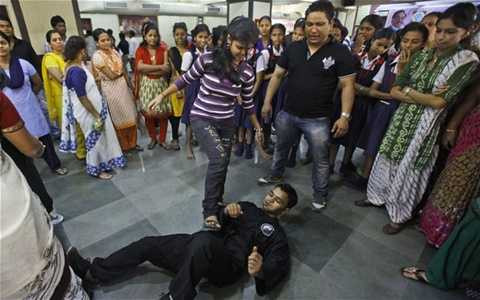 | Một nữ nhân viên trong trường học tham gia khóa tự vệ ở Mumbai, Ấn Độ |