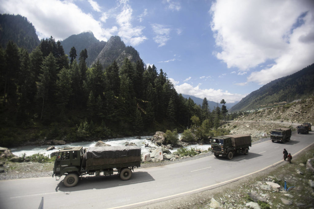 Đoàn xe quân sự của Ấn Độ di chuyển dọc cao tốc Srinagar-Leh, biên giới giữa Ấn Độ và Trung Quốc. (Ảnh: AP)