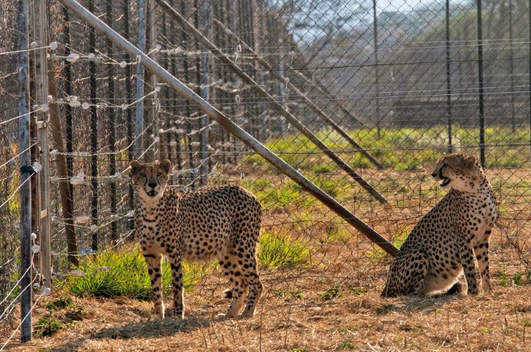Hai con báo gêpa trong khu cách ly của một khu bảo tồn ở Nam Phi, trước khi được chuyển đến Ấn Độ. (Ảnh: AP)
