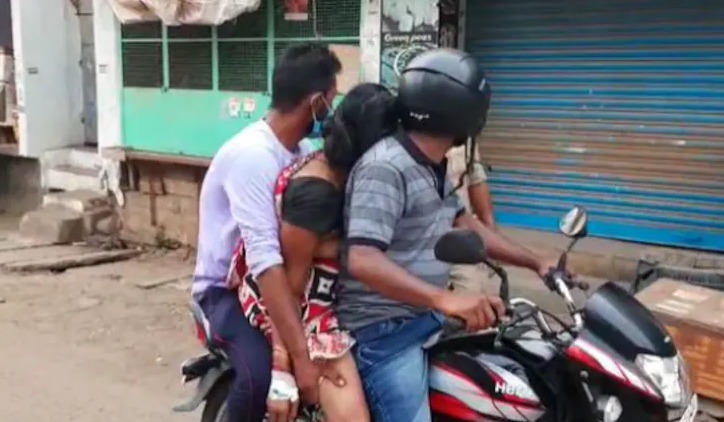 Trong bức ảnh được truyền thông Ấn Độ đăng tải, người con trai ngồi phía trước, người mẹ kẹp giữa còn người con rể ngồi sau để giữ thi thể.