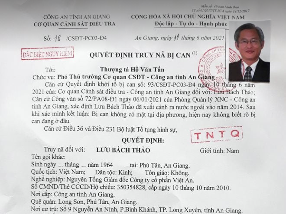 Ngày 22/6, Cơ quan CSĐT Công an tỉnh An Giang quyết định truy nã đặc biệt nguy hiểm đối với bị can Lưu Bách Thảo (57 tuổi, ngụ huyện Phú Tân, tỉnh An Giang), nguyên Tổng Giám đốc Công ty Cổ phần Việt An.