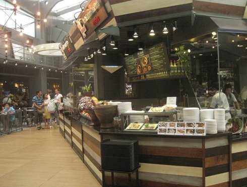 | Quầy chọn món ở Emporium có bảng điện tử (góc trái trên cùng), hiển thị hình ảnh thật của các món để bạn dễ hình dung khi chọn món. Menu hoàn toàn bằng tiếng Anh với giá cả hợp lý. |