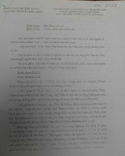 Sau khi ông Nguyễn Thanh Chấn (SN 1961) ở thôn Me, Nghĩa Trung, Việt Yên, Bắc Giang được tạm ngừng thi hành án tù chung thân về tội giết người sau 10 năm tù do hung thủ vụ án Lý Nguyễn Chung ra đầu thú, ngày 10/11, ông Chấn đã cung cấp cho PV bản bào chữa của luật sư Nguyễn Đức Biền, người tham gia bào chữa cho ông trong hai phiên tòa sơ thẩm, phúc thẩm.