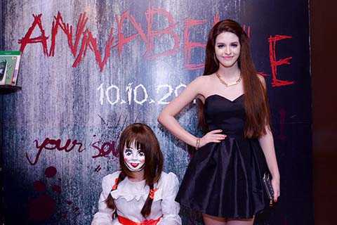 Andrea vai trần xinh đẹp tới tham dự lễ ra mắt phim Annabelle - nguồn gốc về búp bê quỷ ám, phần đầu của The Conjuring – Ám Ảnh kinh hoàng đã từng ra rạp trước đó.