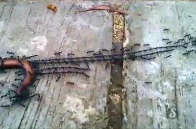 (VTC News) - Đàn kiến đen hợp sức kéo con rết về tổ bằng cách nối nhau thành những "sợi dây".
