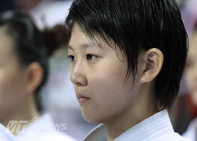 | "Nữ hoàng" kata Nguyễn Hoàng Ngân giành lại Vàng SEA Games sau 3 năm chấn thương. Hình ảnh chụp lúc Hoàng Ngân chờ quyết định của trọng tài. |