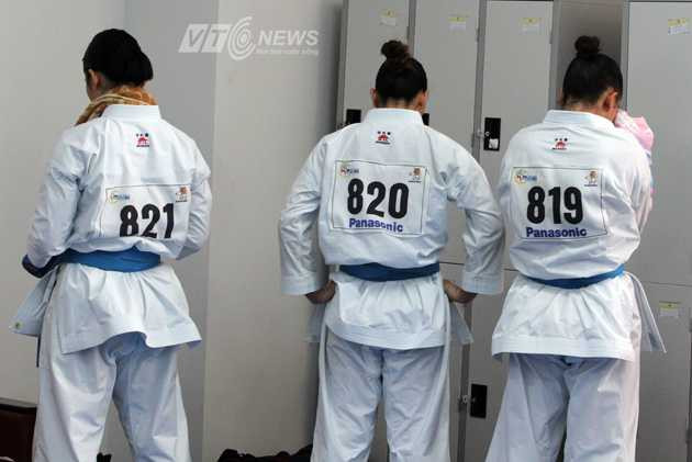 | 3 võ sĩ Hoàng Ngân, Thu Hà, Thanh Hằng đứng quay mặt vào trong để khóc khi bị xử ép ở trận chung kết nội dung đồng đội. Hình ảnh chụp trong phòng chờ của ĐT Karatedo Việt Nam, tại nhà thi đấu Wunna Theikdi. |
