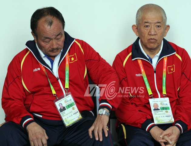| HLV Lê Công và chuyên gia Hidehisa Haseme (Nhật Bản) rất buồn khi phải chứng kiến cảnh học trò bị xử ép. |
