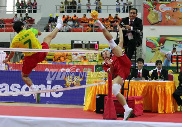 | Một pha tấn công của cầu thủ Thái Lan. Hình ảnh chụp trong trận ĐT nữ Thái Lan gặp ĐT nữ chủ nhà Myanmar ở nội dung đồng đội, môn cầu mây. |