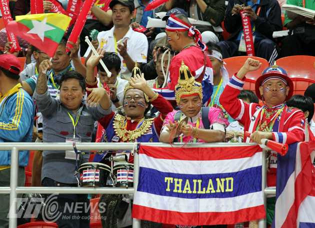 | CĐV Thái Lan và CĐV Myanmar cùng nhảy múa trên khán đài nhà thi đấu Wunna Theikdi |