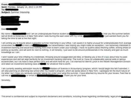 Trong bức thư được chia sẻ trên tờ Business Insider, cậu giải thích rằng mình “không có kỹ năng gì đặc biệt hay những khả năng thiên tài” nhưng cậu sẽ làm bất cứ công việc gì trong kỳ thực tập, kể cả “đánh giày hay đi lấy quần áo ở tiệm giặt là”.