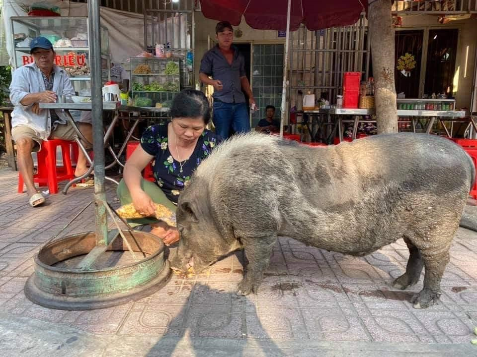 "Sáng qua trong khi chờ rửa xe trên đường Huỳnh Văn Lũy, đoạn gần trường học Lê Văn Tám (phường Quang Vinh - Biên Hòa) bỗng thấy một con heo mọi chắc cả 100kg lững thững đi vào một quán bán bún riêu rồi nằm ì ra đó. Chị chủ quán nói nó đến xin ăn đó, khi nào cho ăn no sẽ đi. Rồi chị chạy vào nhà lấy ra một bịch hạt cho ăn. Chị cười nói nó ăn chay. Đúng là sau khi ăn no, chú heo từ từ hiên ngang ra về đi giữa đường bất chấp Luật Giao thông.
