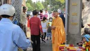 | Cổng chùa Phước Hải - quận 1 nở rộ nạn sư giả khất thực và ăn xin bao vây. |
