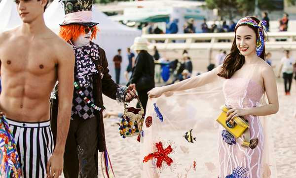 Buổi chụp ảnh được thực hiện ngay trên bờ biển xinh đẹp của Cannes và mọi người kết hợp cùng nhau rất ăn ý. Trong ảnh, Phương Trinh cầm phụ kiện và khăn của Dolce&Gabbana.