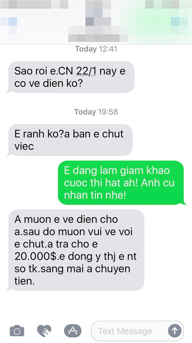 Cụ thể tin nhắn của bầu show mà nữ ca sĩ chia sẻ như sau"Anh muốn em về diễn cho anh, sau đó muốn vui vẻ với em chút. Anh trả cho em 20.000 USD. Em đồng ý thì em nhắn tin số tài khoản, sáng mai anh chuyển tiền". Lời gạ gẫm khiến Pha Lê vô cùng tức giận, cô đã quyết định chụp ảnh màn hình công khai số điện thoại của anh ta cho mọi người biết.