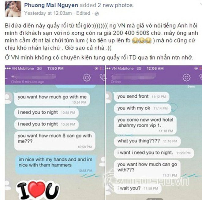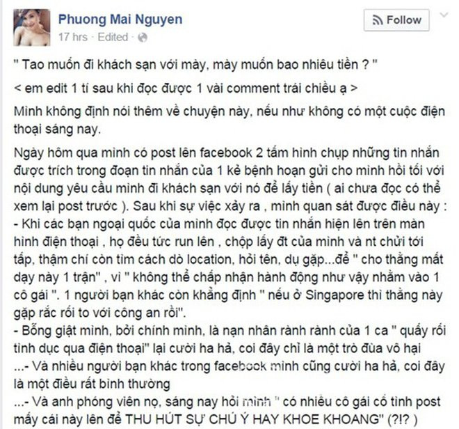 Siêu mẫu Phương Mai đã bày tỏ thái độ vô cùng tức giận khi đăng tải trên Facebook ảnh chụp màn hình số điện thoại nhắn tin quấy rối tình dục. Cô nàng chia sẻ "Bị đứa điên này quấy rối từ tối giờ. Người Việt Nam mà giả vờ nói tiếng Anh, hỏi mình đi khách sạn với nó xong còn ra giá 200, 400, 500 USD". Ngay sau khi công khai đoạn tin nhắn, cô nàng nhận được nhiều lời động viên và rất nhiều các nghệ sĩ cũng không khỏi lo sợ trước câu chuyện này.