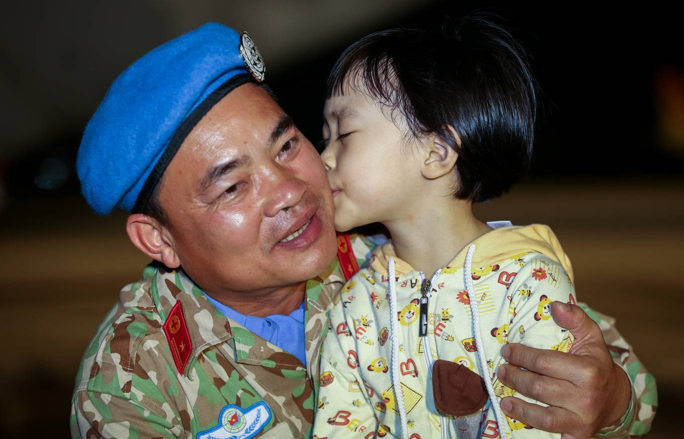 Bé Phương Thảo (6 tuổi) thơm má bố - thiếu tá Phan Bá Hiếu. "Được đại diện cho đất nước làm nhiệm vụ quốc tế là niềm vinh dự, tự hào đối với tôi. Các anh em ở đây vẫn thích nghi với thời tiết khắc nghiệt, hoàn thành việc khám chữa bệnh cho người dân", thiếu tá Hiếu nói.