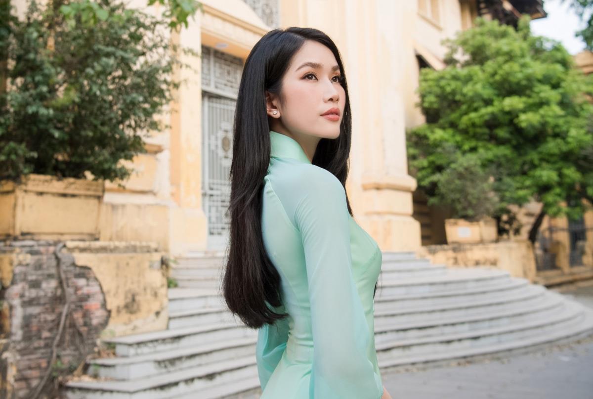 Cô đẹp dịu dàng trong tà áo dài xanh ngọc.