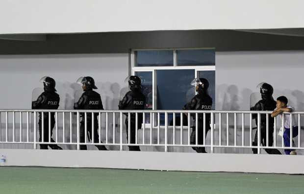 | Cảnh sát đi tuần ở hành lang sân Zeyar Thiri |