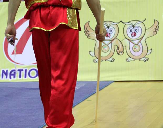 | Nguyễn Mạnh Quyền rời thảm đấu vì bị loại trực tiếp do để gãy côn trong thi đấu. |