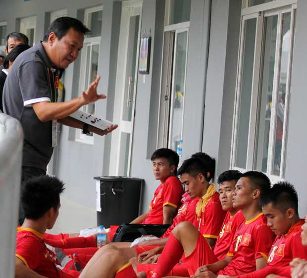 | U23 Việt Nam nghỉ giữa hai hiệp ngoài hành lang sân Zeyar Thiri |