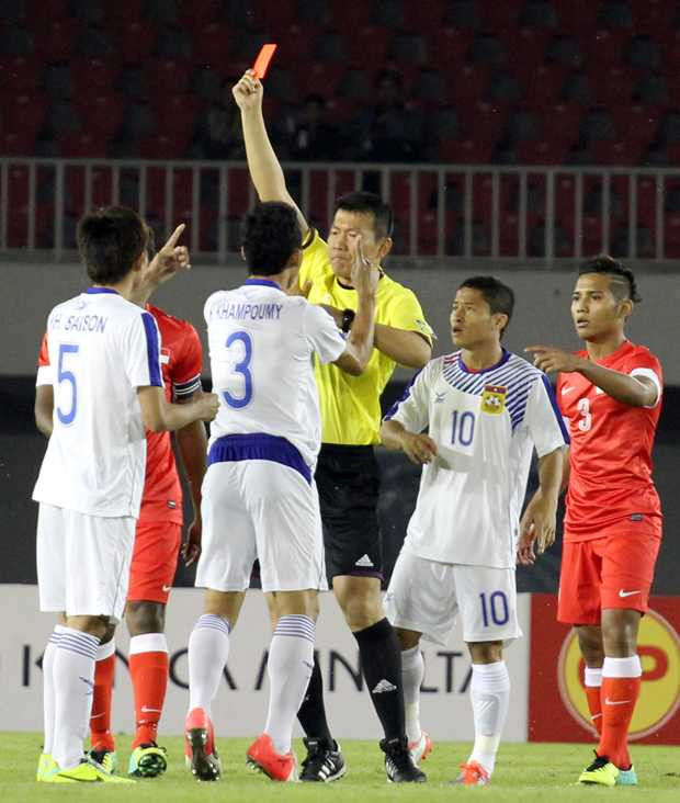 | Saison Khounsamnan (5) của U23 Lào nhận thẻ đỏ từ trọng tài Wang Zhe ngay phút thứ 2, trận U23 Lào - U23 Singapore. |