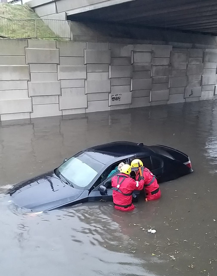Lính cứu hỏa giải cứu một người khỏi xe bị ngập lụt ở Blackpool. (Ảnh: PA)