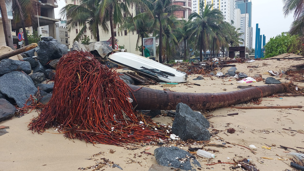Cảnh tan hoang tại bãi biển Đà Nẵng trong sáng 15/11 sau khi bão Vamco quét qua. Rác bị sóng đánh tấp lên bờ kè dọc tuyến đường Võ Nguyên Giáp-Hoàng Sa-Trường Sa.
