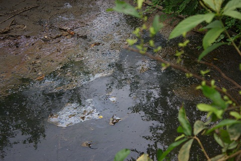 Tại một số điểm trên con mương dẫn nước thải ra sông Bưởi, nhiều nơi nước đã cạn nhưng vẫn để lại mùi hôi thối nồng nặc, kèm theo lớp váng bám vào đất bùn. Một chỗ khác, nước không thoát được đọng thành vũng đen ngòm, mùi hôi thối cũng bốc lên nồng nặc và mặt nước có nổi lớp váng màu vàng đậm.