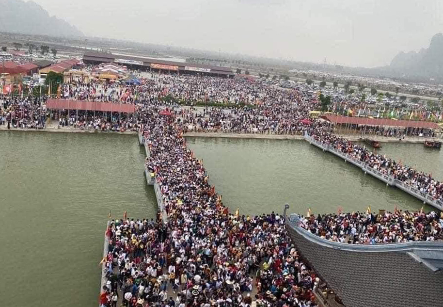 Từng đoàn người chen chân chờ được mua vé thuyền, vé xe điện để tham quan khu du lịch tâm linh Tam Chúc.