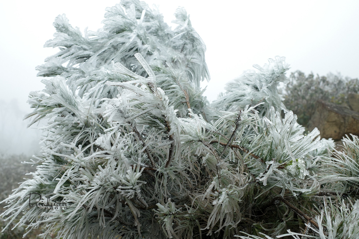 Trên các đỉnh núi cao thuộc dãy Cao Ly huyện Bình Liêu, băng giá phủ kín từng nhánh cây. (Ảnh: Cường Pin)