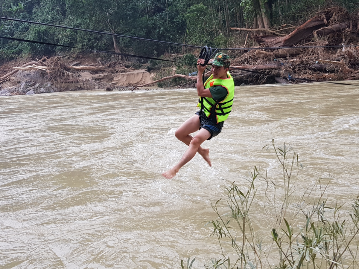 Hơn tuần nay, nhóm cán bộ, chiến sĩ tham gia tìm kiếm nạn nhân còn mất tích bắc ròng rọc để sang bên kia sông Leng.