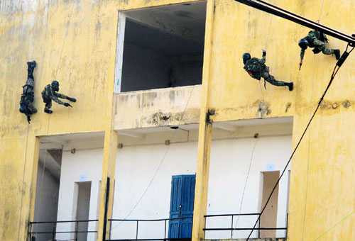 Hình ảnh bộ đội đặc công thực hành giải cứu con tin ở địa hình thành phố, dò gỡ mìn, vượt vật cản đánh chiếm mục tiêu và kỹ thuật bắn súng đặc chủng.