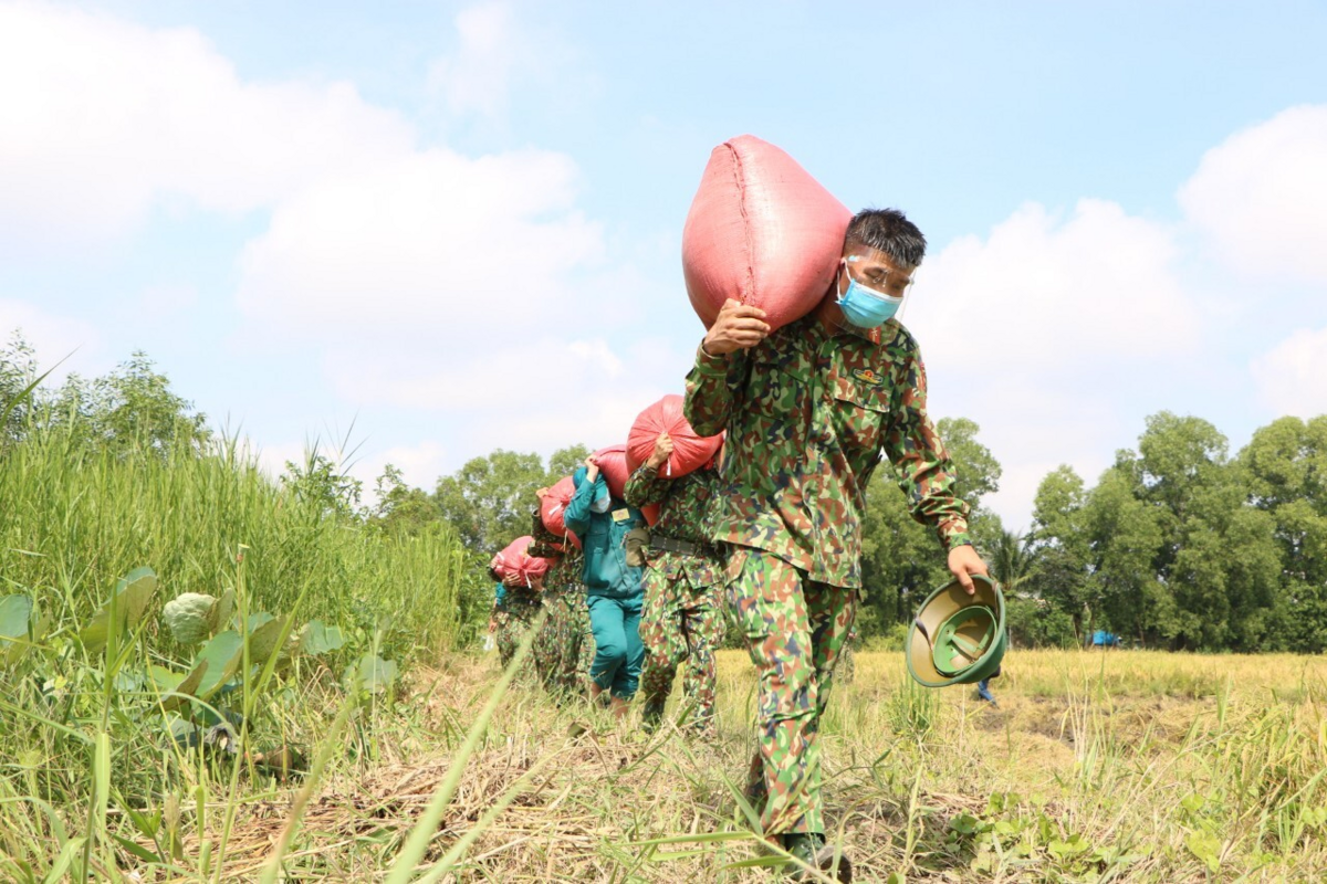 Hình ảnh các chiến sĩ trẻ không ngại nắng mưa, xông xáo trên đồng ruộng thu hoạch và khuân vác lúa giúp nông dân để lại ấn tượng đẹp, khó quên trong lúc dịch bệnh COVID-19 căng thẳng.