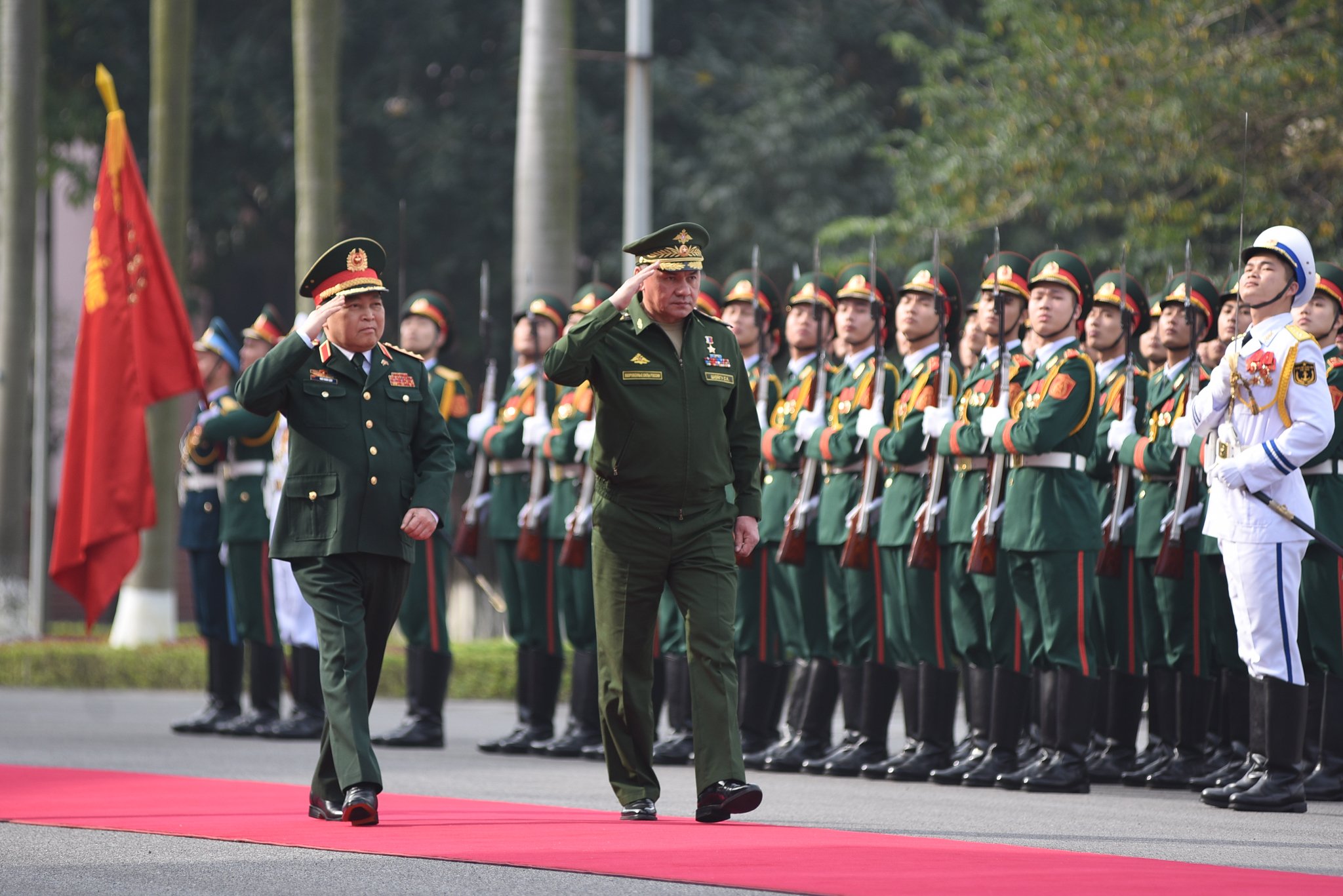 Bộ trưởng Quốc phòng Nga Sergei Shoigu duyệt đội danh dự. (Ảnh: Tùng Đinh)