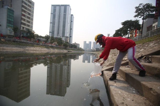Sáng 8/2, nhiều người dân Thủ đô chọn sông Tô Lịch là nơi thả cá chép trong ngày ông Công ông Táo.