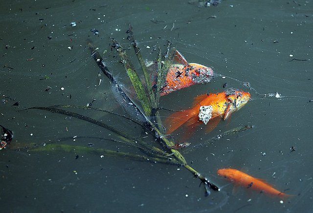Cá được thả vào dòng nước đen đặc, bốc mùi nồng nặc.