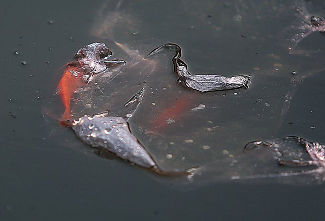Nhiều con cá vẫn còn nguyên trong túi nylon, ra sức quẫy đạp và yếu dần.